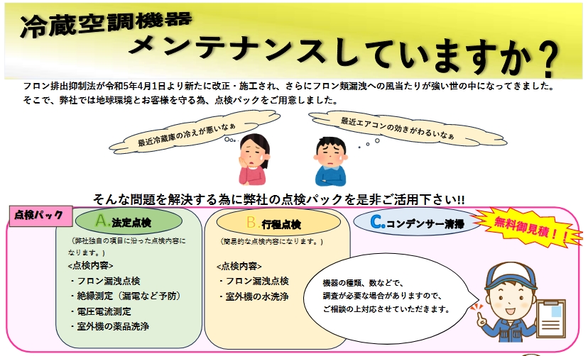 各種空調・冷凍冷蔵設備・厨房機器全般の販売と、24時間365日のメンテナンスを承ります。